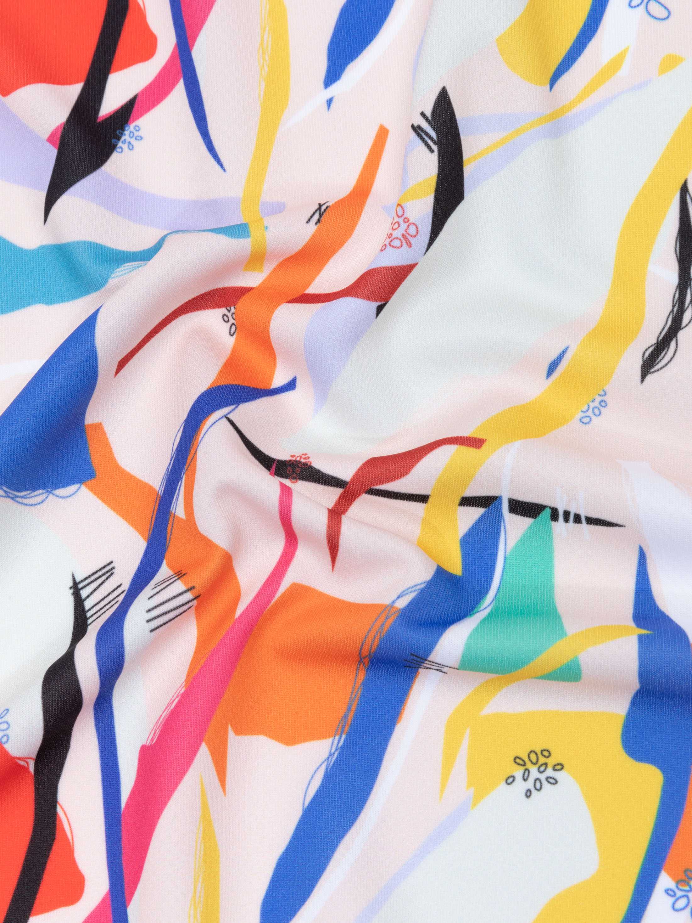 Basfärgen av textilen är kritvit vilket låter färgerna i ditt tryck stå ut mot den vita basen. Slutresultatet är väldigt detaljerat och visar tunna linjer utan att påverkas av materialets textur. Textilen reflekterar ljus trots den matta texturen tack vare en minimal glans i sluttrycket.