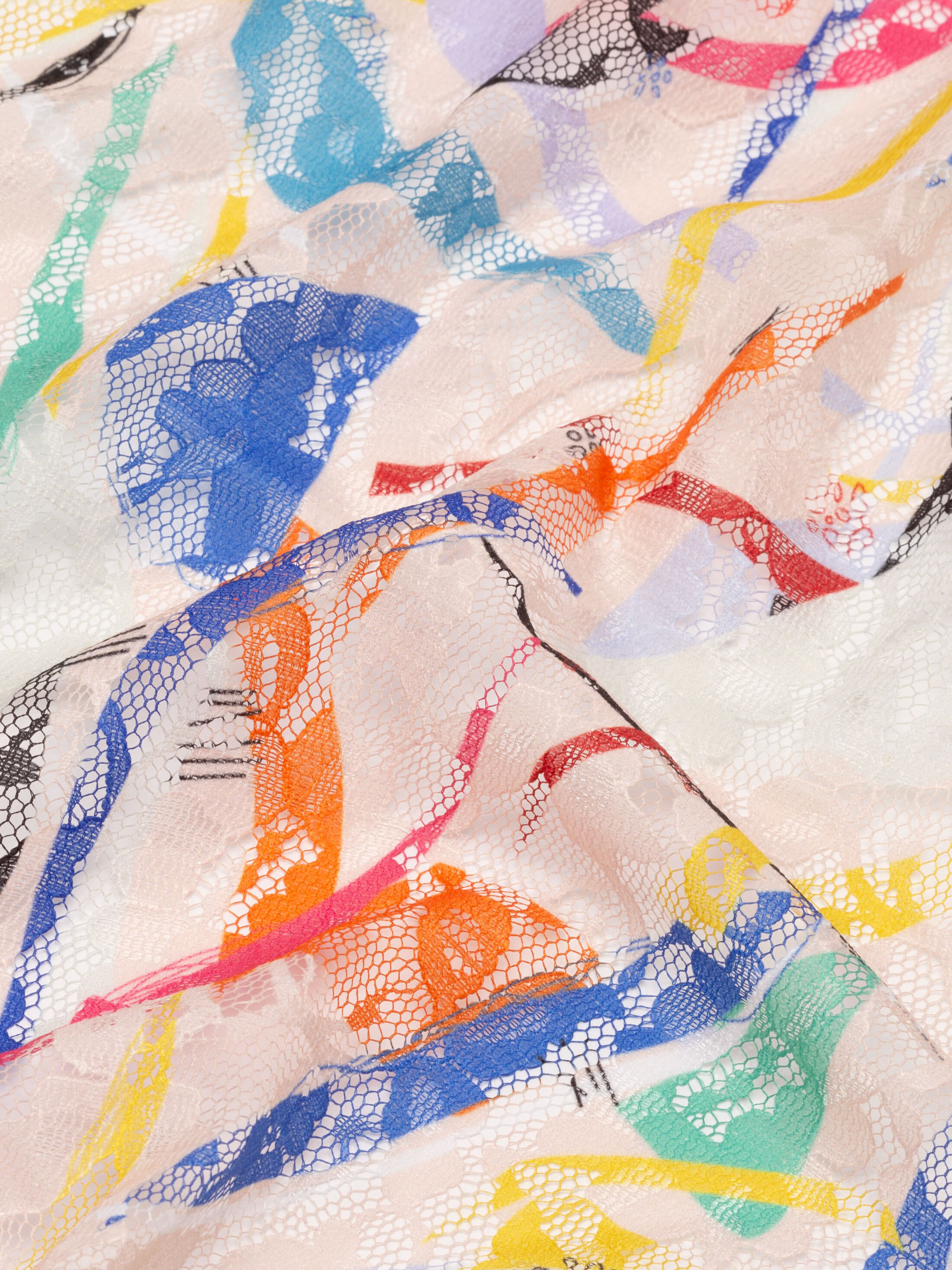 Tryck gör sig annorlunda på spetstyg än textiler av en mer fast struktur. Blommönstret är den enda fasta delen av textilen och det är även där som tryck gör sig bäst. Den bästa designen att använda på spetstyger är mönster utan allt för många detaljer. Små detaljer och tunna linjer kan falla bort så vi rekommenderar stora mönster och blockfärger. Tryckets färger kommer även att skina igenom fint på baksidan av tyget.
