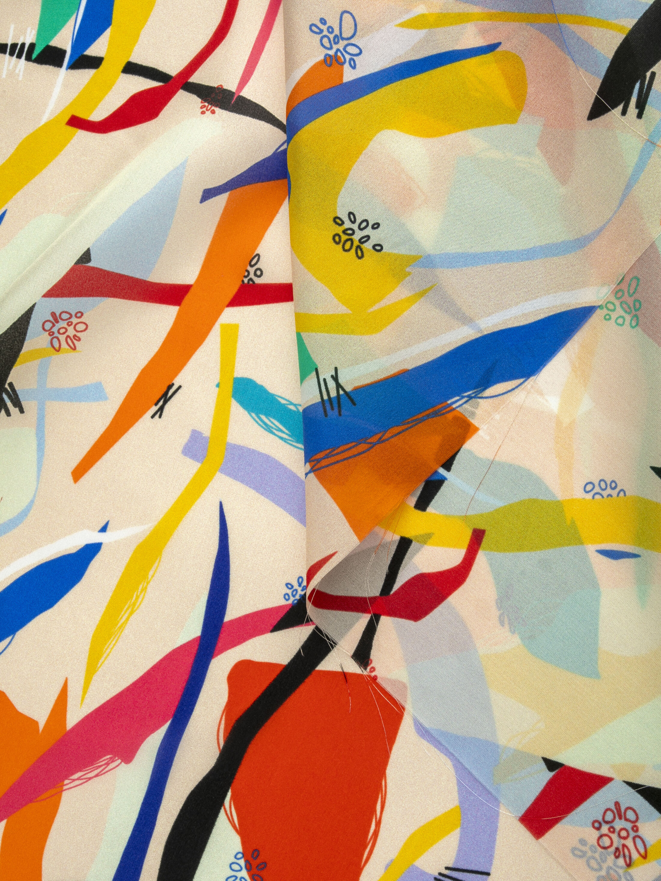 Vi trycker på Habotai-tyget med reaktiva bläck. Färgerna är djärva och intrikata tryckdetaljer syns väl. Det finns en 90% genomgång på baksidan.