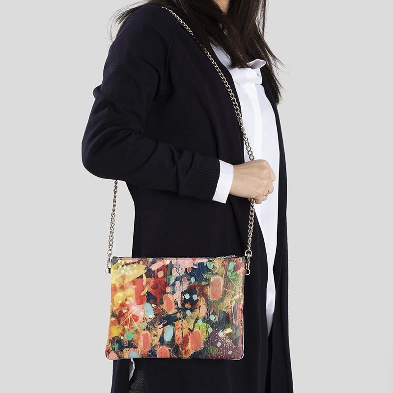 Designa din egen handväska med avtagbar kedjerem. Du kan välja mellan två olika material; 100% äkta nappaläder och ett alternativ av konstläder. Din handväska med eget tryck är fodrad med lyxig Suede Vision som har en neutral beige färg som passar din design oavsett vad du väljer att göra med den. Den silver- eller guldfärgade kedjeremmen är nickelpläterad och matchar dragkedjan vacker. Du kan tryck på fram- och baksidan var för sig, så du kan välja att ha samma eller olika designer.