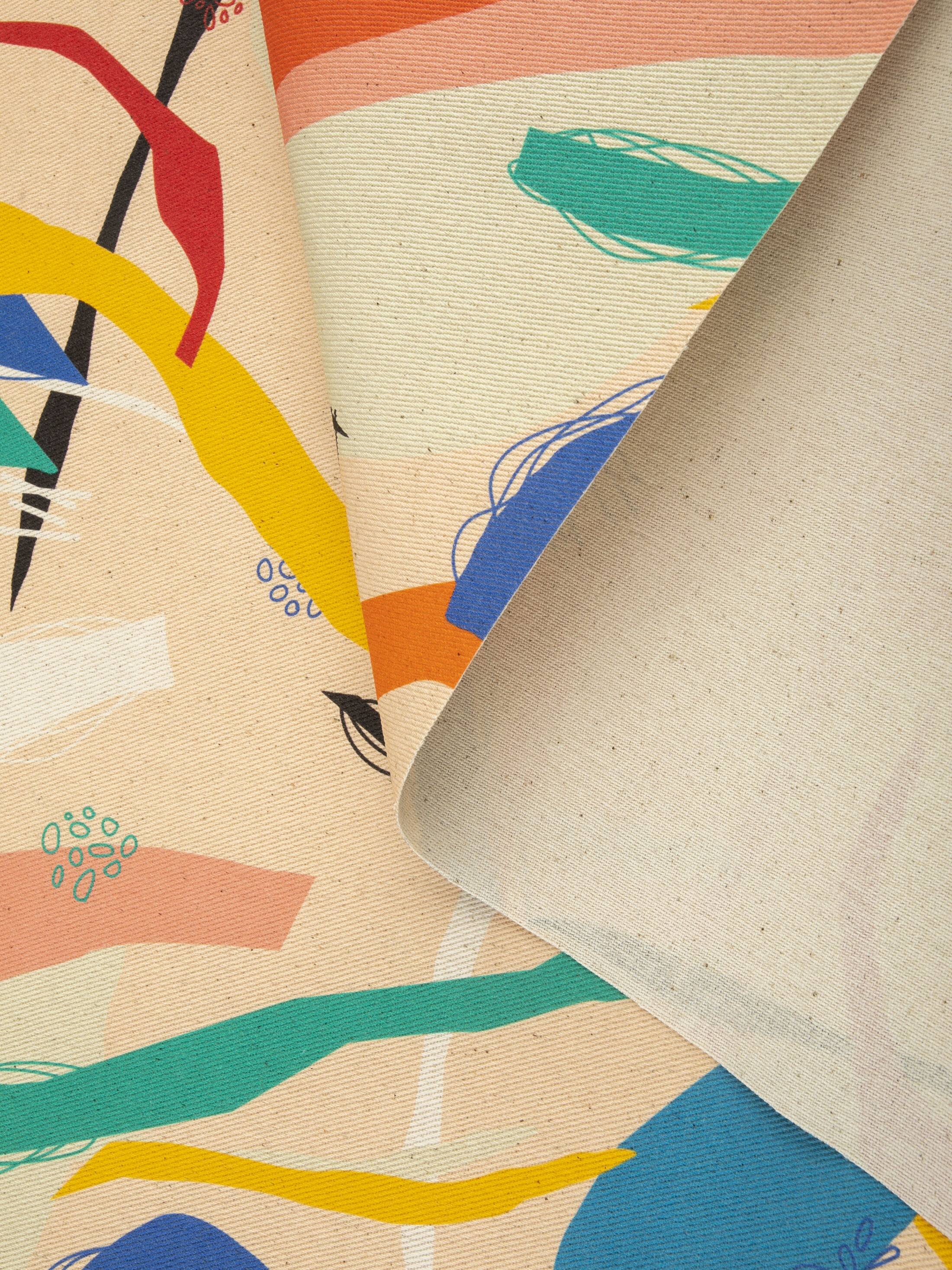 Ett medium till tungt, naturligt, oblekt 100 % bomulls borrtyg. Vävd av 100% certifierad ekologisk bomull. Tryckt med pigmentbläck, den jordnära naturliga bastonen i tyget ger dina utskrifter en lite vintagekänsla. Denna textil har ett styvt handtag och tyngre vikt, även om den mjuknar med tvätt. Lämplig för att göra kuddar, lätt klädsel, jackor, byxor och väskor. Beställ dina testutskrifter idag.