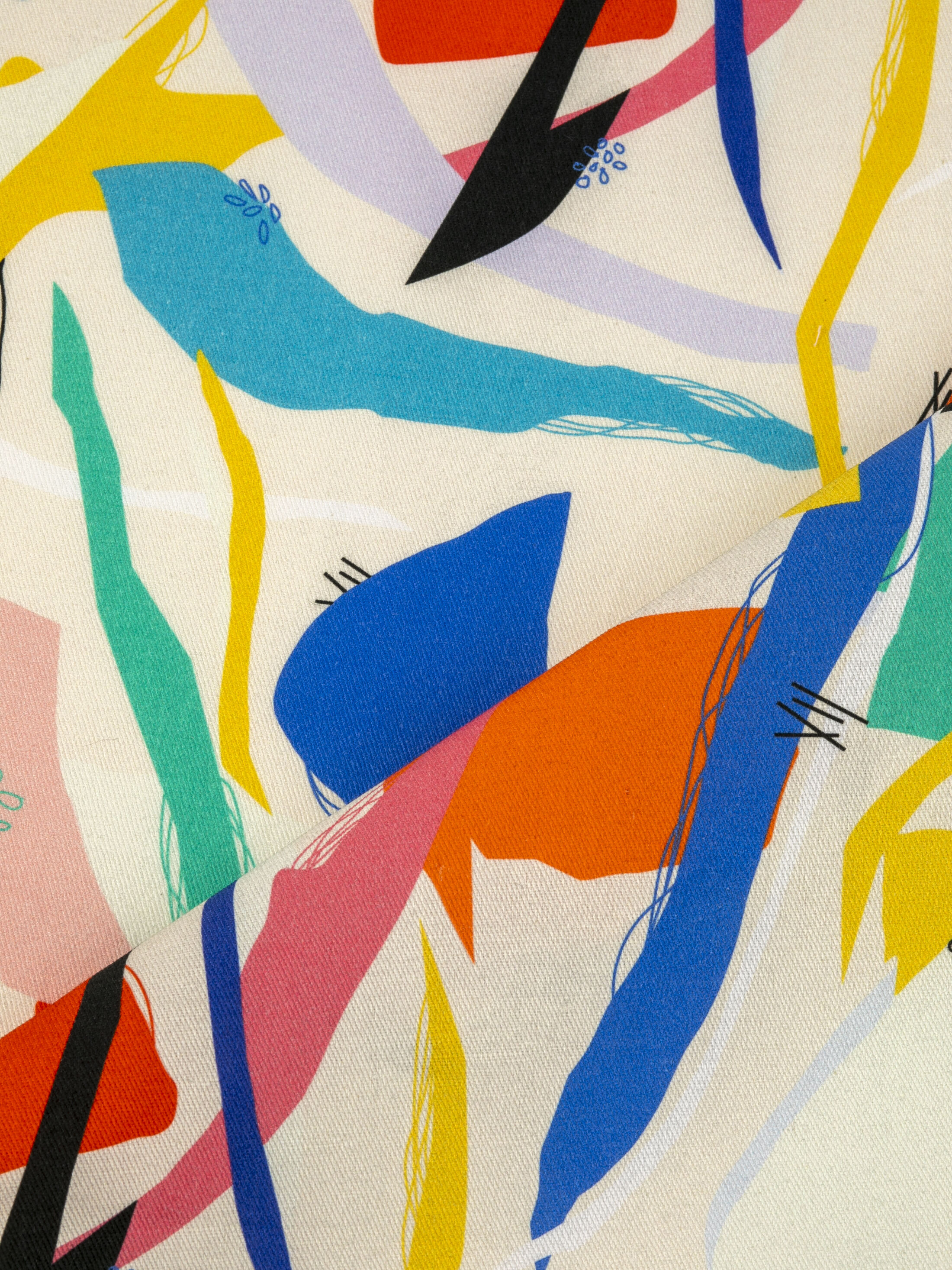Twill-hampa bomullstyget har en subtil diagonal väv, karakteristisk för kyperttyger, som ger en strukturerad men jämn finish. Denna unika yta förstärker djupet och rikedomen hos tryckta mönster, vilket gör den till en favorit för både visuella och taktila tilltalande. Hampa- och bomullsblandningen säkerställer en naturlig, andningsbar textur som känns mjuk men ändå robust.