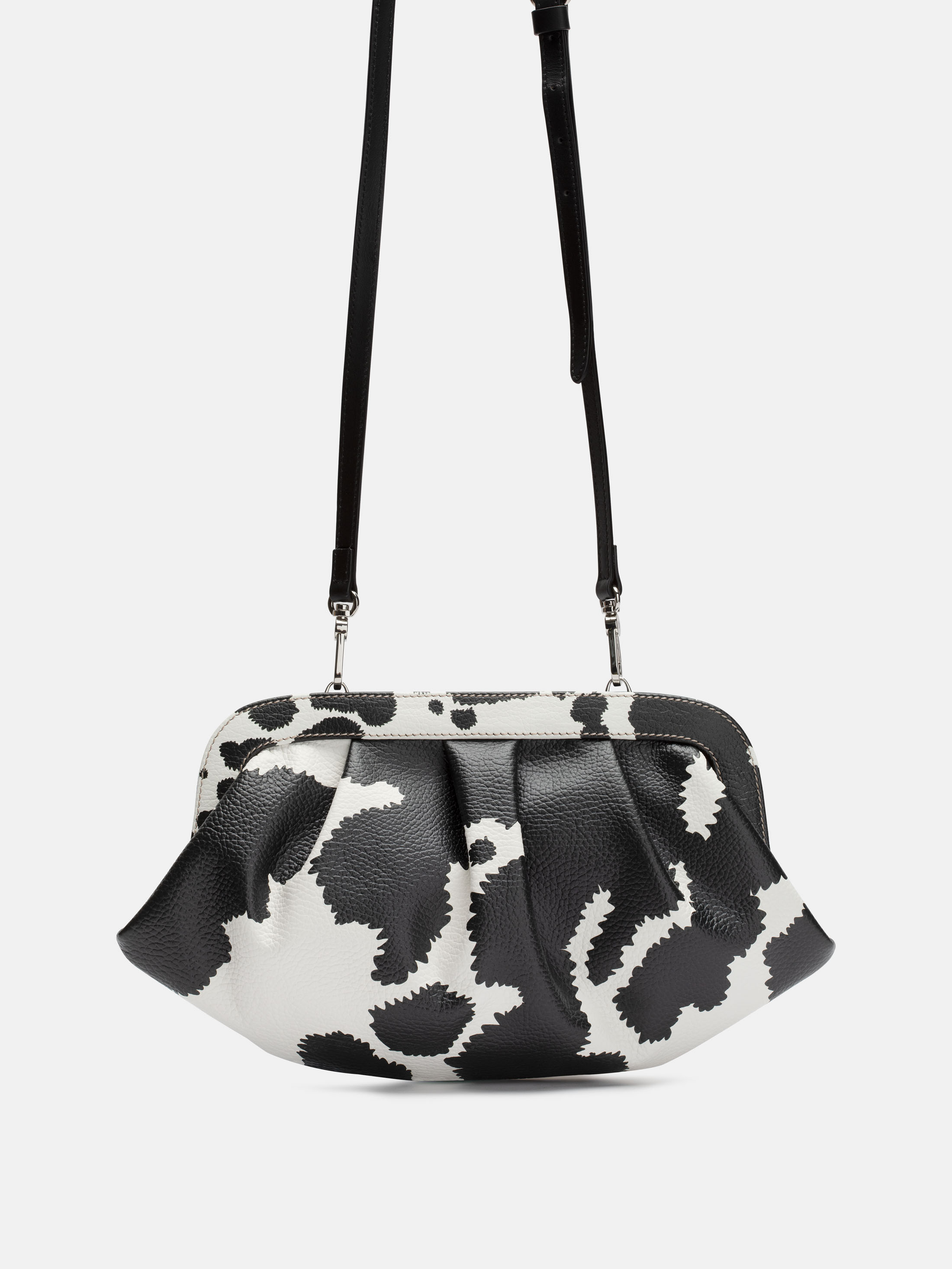Designa fram-och baksidan, och ovansidan av ramen på denna veckade väska. Detta ger dig totalt fyra ytor att designa. Du kan dessutom välja vilken typ av lädertextur du vill ha, samt färg på metalldetaljerna och sömnadstråden. Remmen och insidan på ramens ovansida tillverkas av lent, svart Nappaläder.